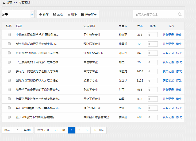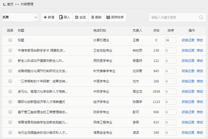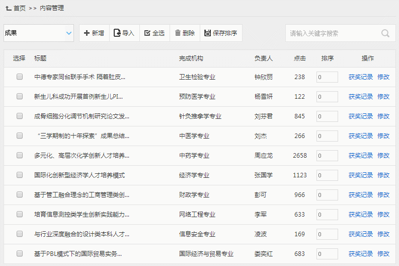 此模块用于对教学成果信息进行管理。您可进行新增、修改、导入、删除、筛选等操作。您可以通过在内容管理界面左上角栏目选择下拉框中选择教学成果栏目,进入教学成果界面。