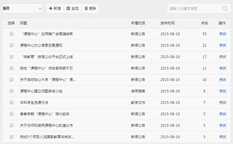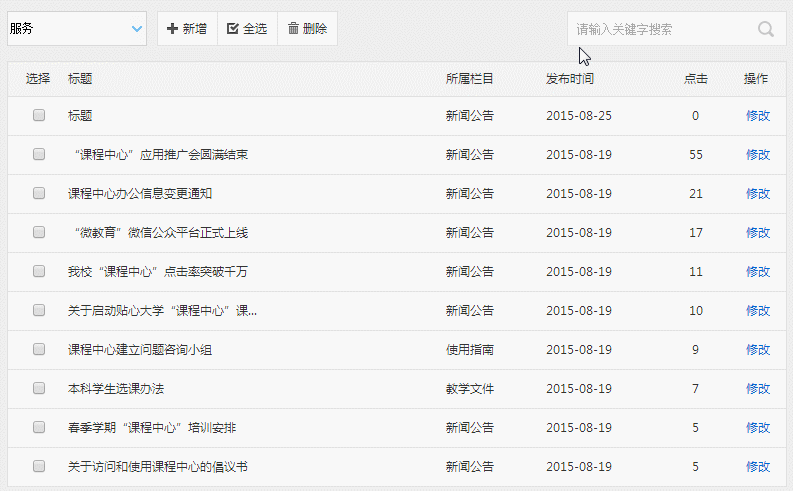 此模块用于对文章内容进行管理。您可进行新增、修改、删除、筛选等操作。