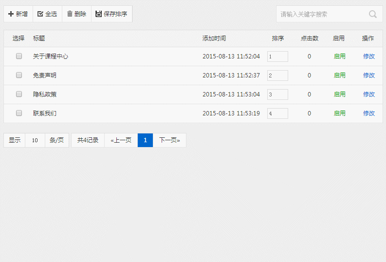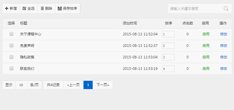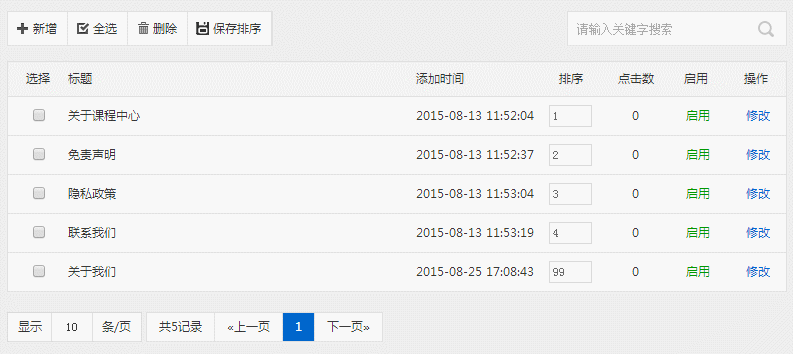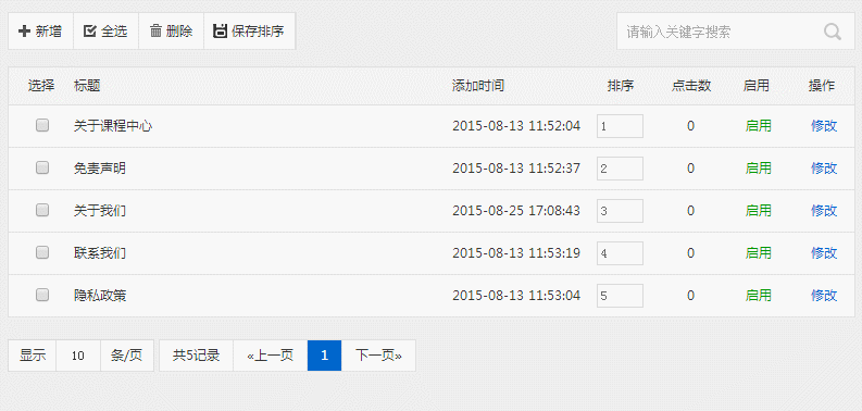 此模块用于对底部链接信息进行管理。您可进行新增、修改、启用/停用、排序、删除、筛选等操作。