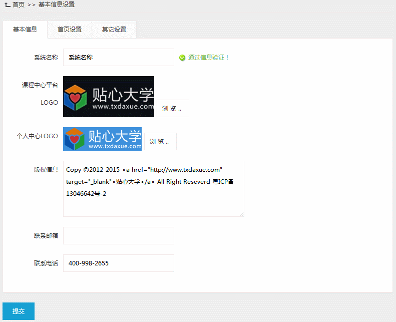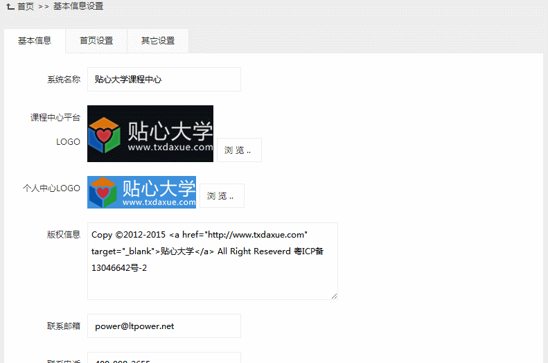 此模块用于管理课程中心的基本信息,包括基本信息、首页设置、其它设置三块。