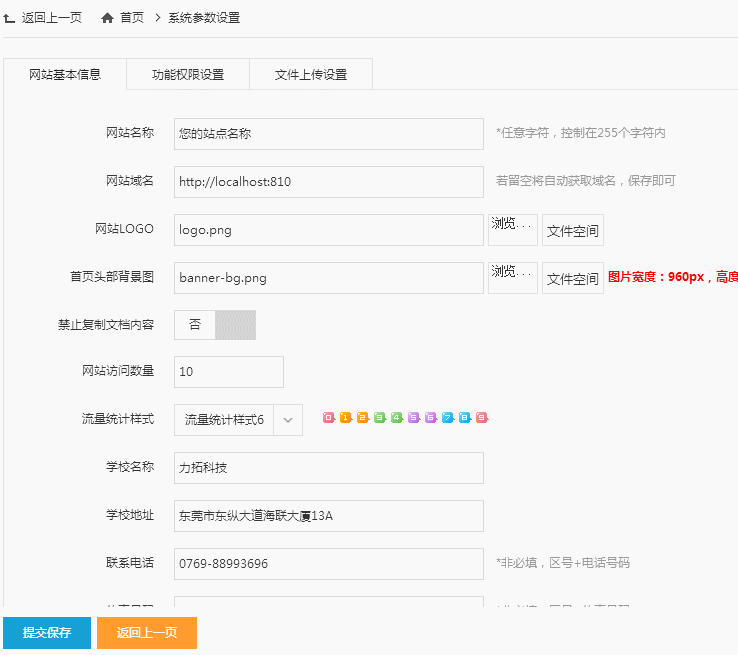您可以通过此模块来详细描述您的网站信息;可以修改您的网站LOGO及banner;可以修改您的学校信息及联系方式等详细信息(当您的平台首页有调用这些信息时,准确的信息能够提供给访客快速联系到您的方法)。具体选项及描述如下: