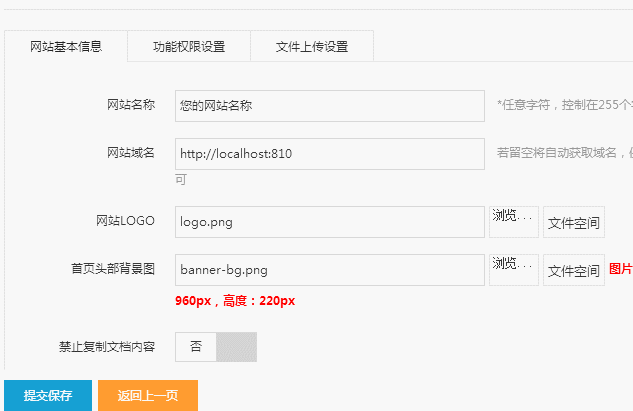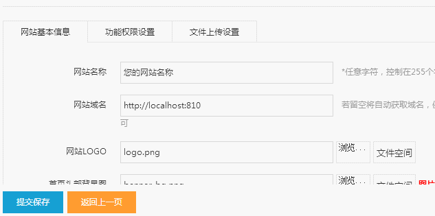 此模块用于描述网站的系统信息以及控制网站的功能权限、平台首页的显示效果,模块子分类为网站基本信息、功能权限设置、文件上传设置、首页设置。