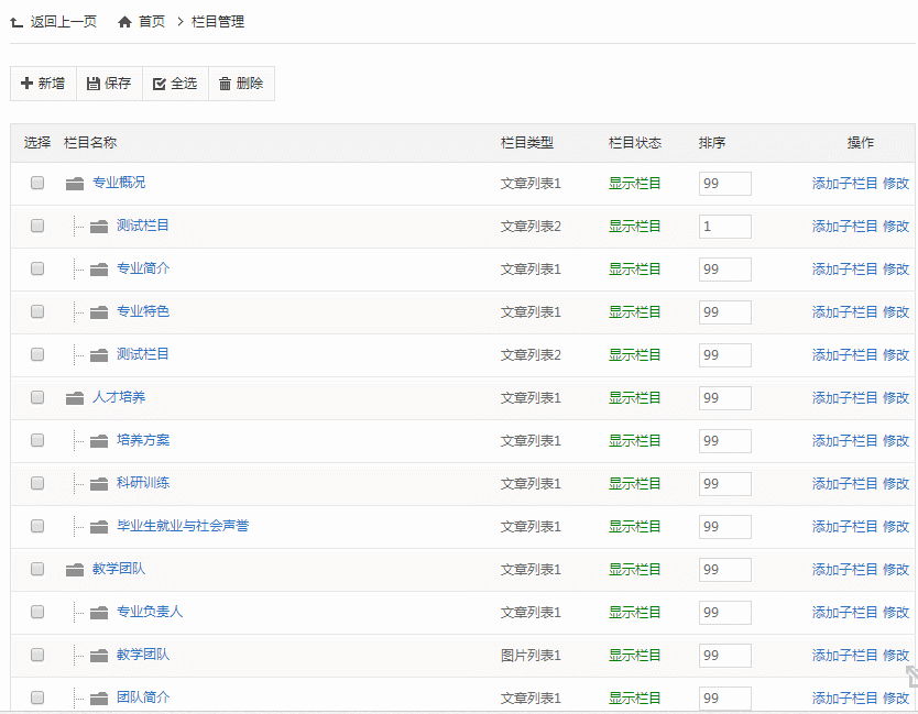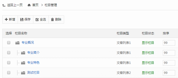 提供新增、保存、全选、删除四个主按钮。您可以通过此模块进行修改和增加网站栏目、子栏目。您可以控制点击栏目后的跳转链接,甚至单独对某一个栏目进行SEO优化等等。