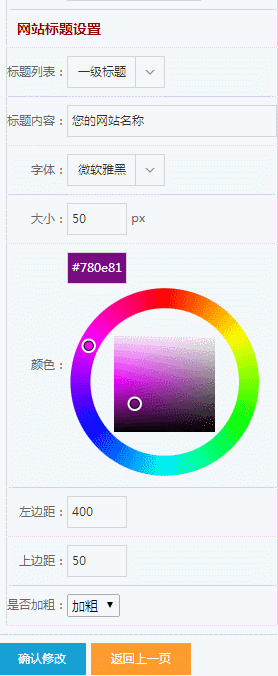 | 颜色 | 您可以通过鼠标点击色域和滑动色环来改变标题的颜色,色环上方的方块将会实时显示当前颜色和代码值。 |