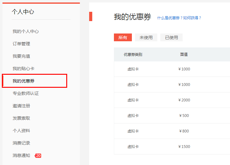 进入“个人中心” > “我的优惠券”,在此可查看未使用优惠券、已使用优惠券、已过期优惠券。