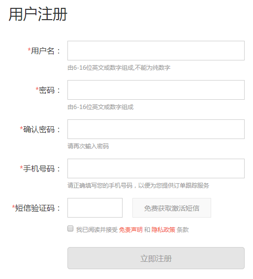 第二步,按要求输入帐号密码、手机号码后点击“免费获取激活短信”