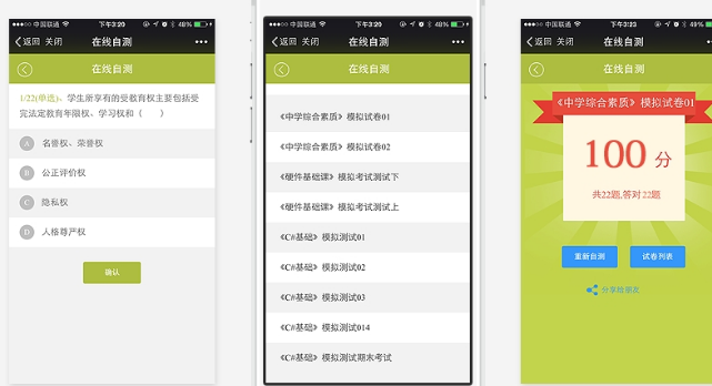 考试是最常用的检验培训效果的方式,考试功能也是一个非常受重视的功能,在正式考试之前学员还可以做练习卷进行自测。移动互联网 的普及,打破了局限于固定时间、固定场所才能进行考试的传统场景。搬到手机端的在线考试,凭借其随时随地的便利和较少的培训支出受到了培训管理人员的欢迎。此外,与传统考试相比,移动学习平台上的考试还可以完成更多个性化和娱乐化的处理,如:考试结果及时反馈:考试数据自动生成每个学员的自适应错题库, 强化学习效果;再如趣味化管理,让学习和考试在一系列的游戏中细无声地完成。以中信银行卡中心基于移动学习平台的“一站到底”考试为例,每一次的考试都以 闯关形式进行,有排名、有竞争、有奖品,趣味化的运营取得了非常不错的效果。