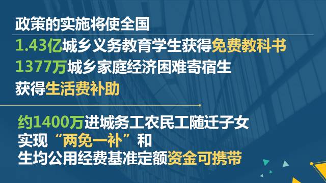 政策的实施将使全国1.43亿城乡义务教育学生获得免费教科书,1377万城乡家庭经济困难寄宿生获得生活费补助,约1400万进城务工农民工随迁子女实现“两免一补”和生均公用经费基准定额资金可携带。